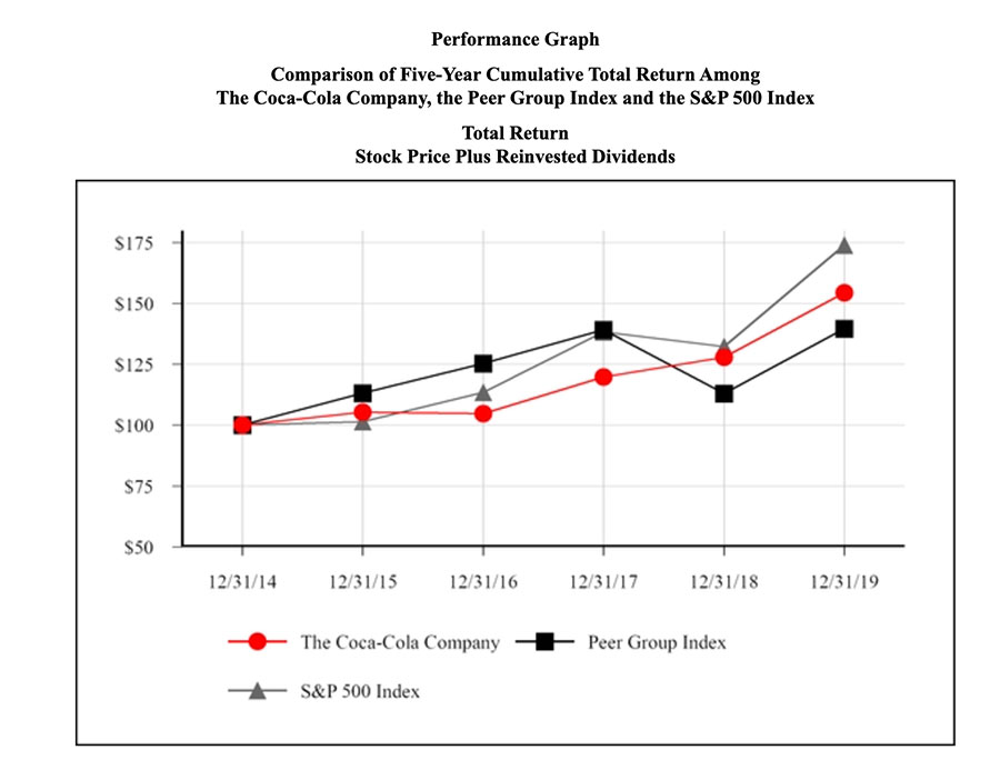 A Coca-Cola apresentou um retorno total cumulativo de cinco anos consistente, mas abaixo do índice S&P 500. Em relação a outras empresas do setor, a Coca-Cola começou com um desempenho inferior, mas conseguiu fechar o período com resultados semelhantes.